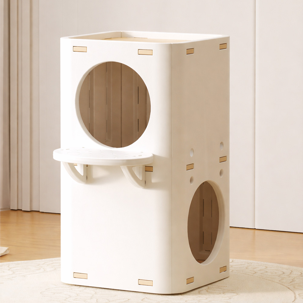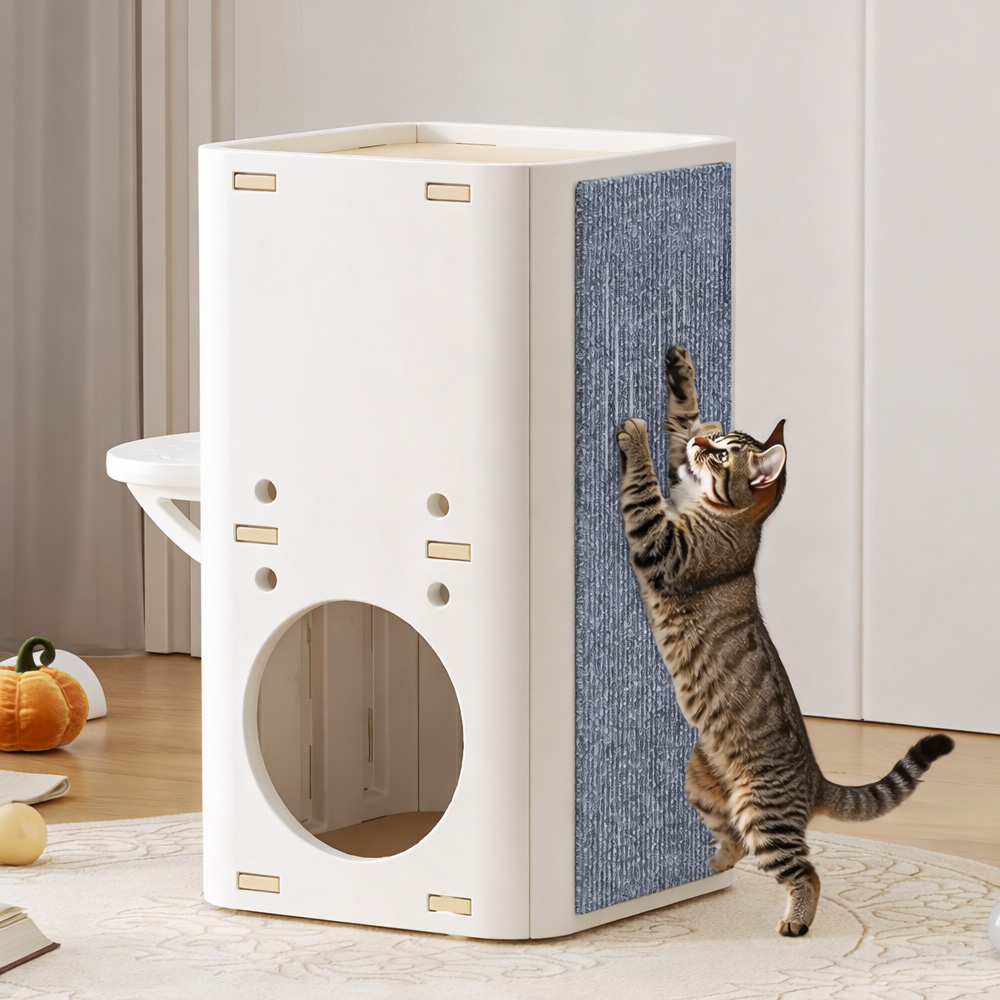 貓咪天生喜歡跳躍、登高與觀察環境,雲端雙層貓屋以立體雙層結構設計,結合貓窩與跳台功能,讓貓咪能在上下移動中活動筋骨,同時擁有安心休息的空間。上層適合跳躍與短暫停留,下層則提供穩定的貓窩休息區,滿足貓咪玩樂與放鬆的不同需求。